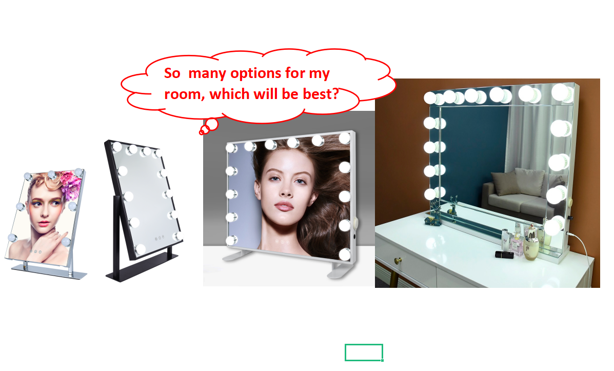 2nd, For the Medium room space, it is better to put a medium size Hollywood mirror on the desk, the size can be 400*500mm. If there is more space you also can consider a magnification handle mirror for details makeup like the eye part.